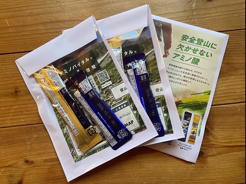 参加者の皆様にはツアー前、ご希望の方の方にアミノバイタルのサンプルを配ってますのでお声がけください。また利用後の感想を教えて頂ければと思います。配り終わったらお終いのサービスとなります。